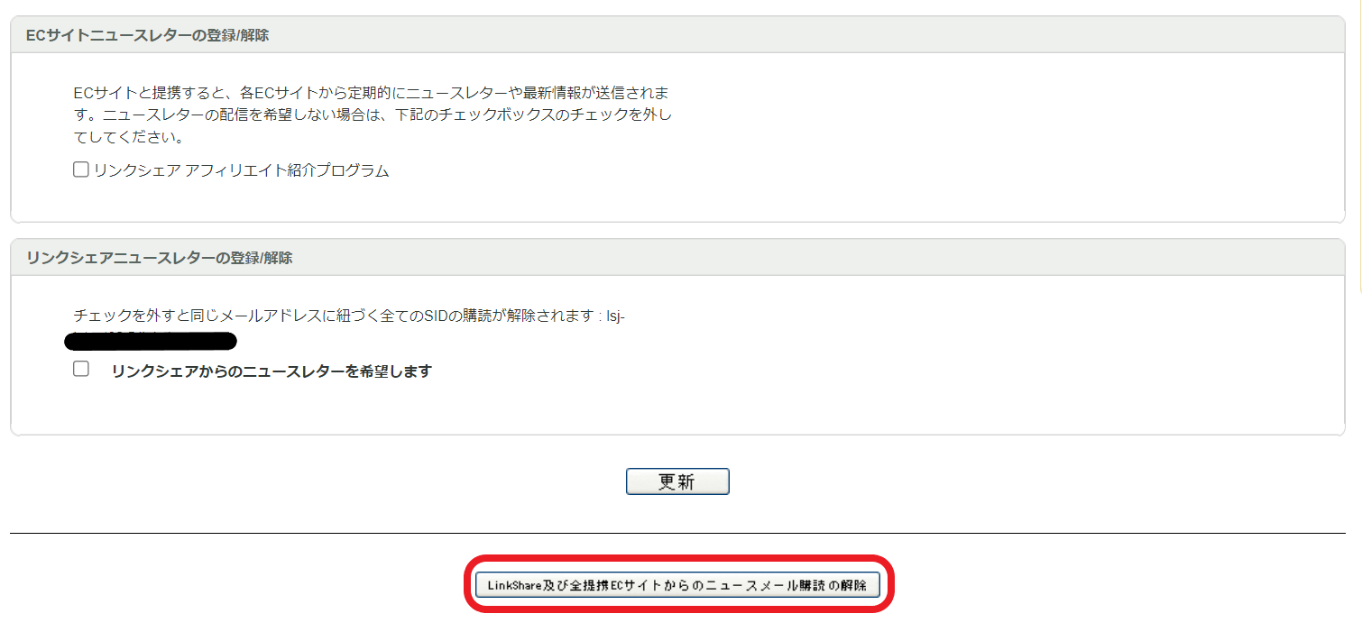 - 画面下部にある[LinkShare及び全提携ECサイトからのニュースメール購読の解除]ボタンをクリック