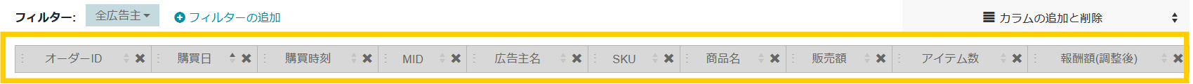 - フィルタ機能を使用し、特定の広告主に絞り込んだり、フィルターの追加ができます。