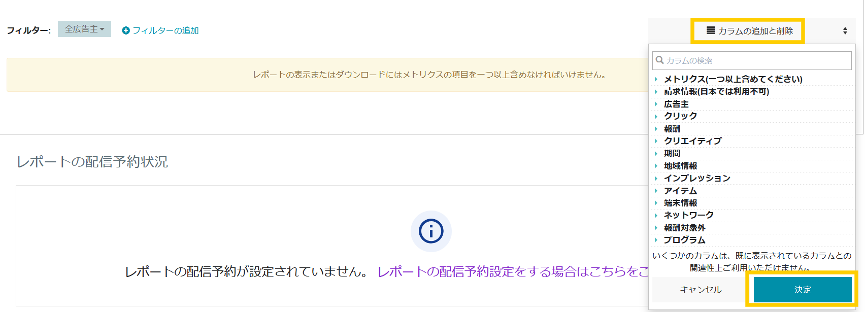 - 「カラムの追加と削除」からレポートに含めたい項目を選択し、「決定」をクリックします。